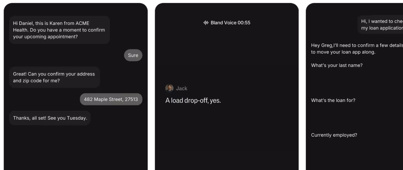 Narration is not a conversation. When customers interrupt, ask questions, or require a transaction, a TTS-only approach fails. Bland creates bidirectional phone conversations that understand intent, handle interruptions, and keep context across channels